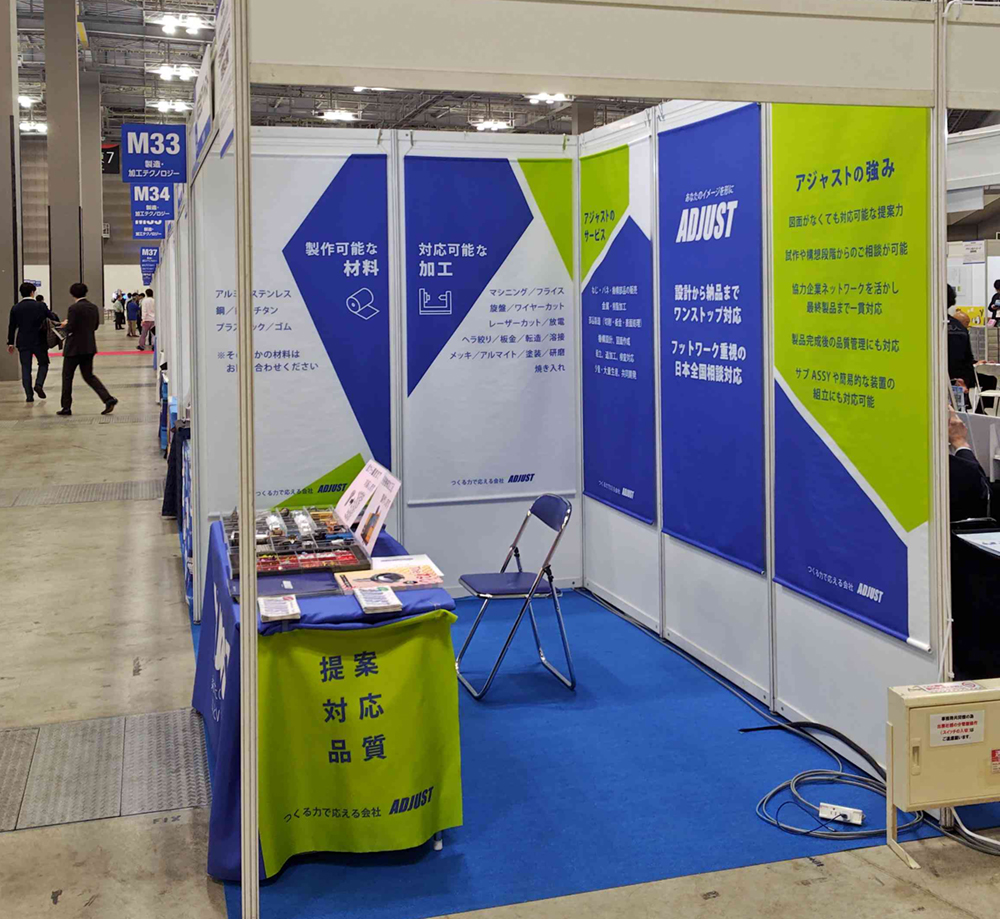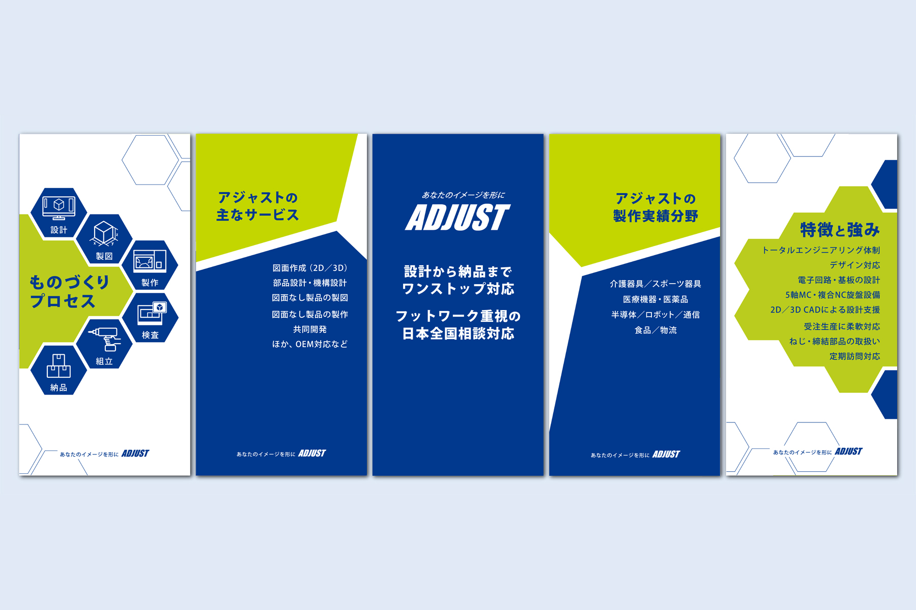 展示会場で埋もれずに存在感を放つため、「シンプル&コントラスト」をテーマにデザイン。六角形を基調に、ナットやボルトといったモチーフでアジャストらしさを表現。フォントサイズや配色にメリハリをつけ、情報にも優先順位を持たせることで、限られたスペースでも伝わる構成に。
